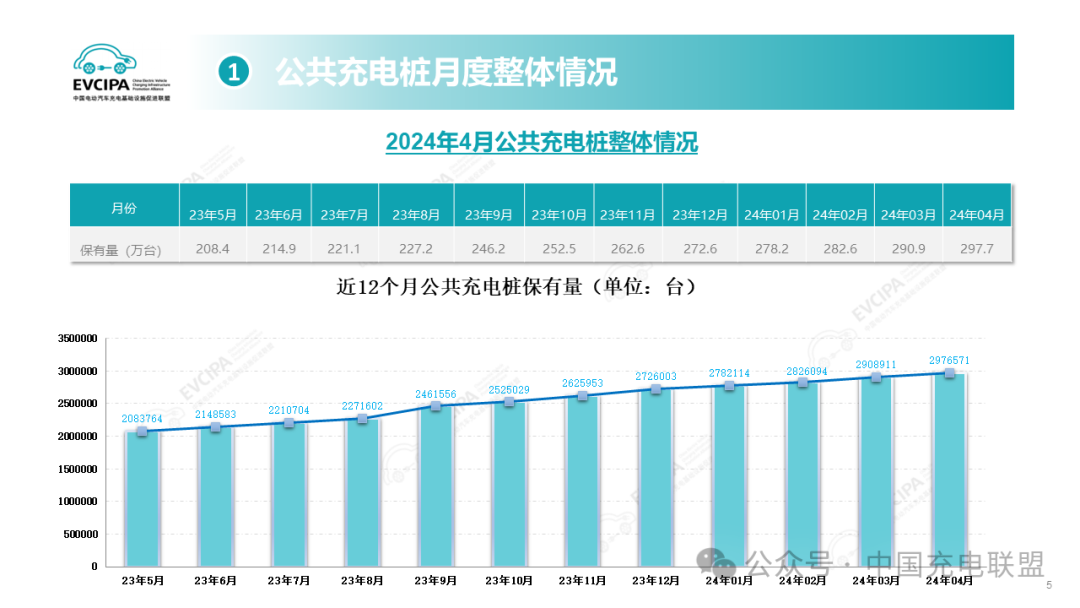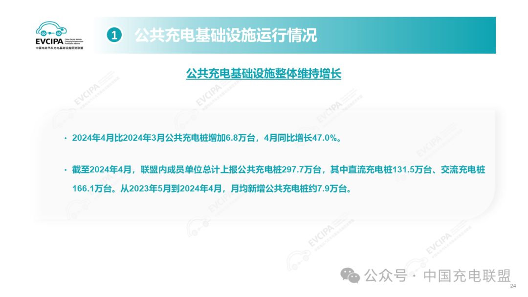 公共充电基础设施运行情况,2024年4月比2024年3月公共充电桩增加6.8万台,4月同比增长47.0%。截至2024年4月,联盟内成员单位总计上报公共充电桩297.7万台,其中直流充电桩131.5万台、交流充电桩166.1万台。从2023年5月到2024年4月,月均新增公共充电桩约7.9万台。