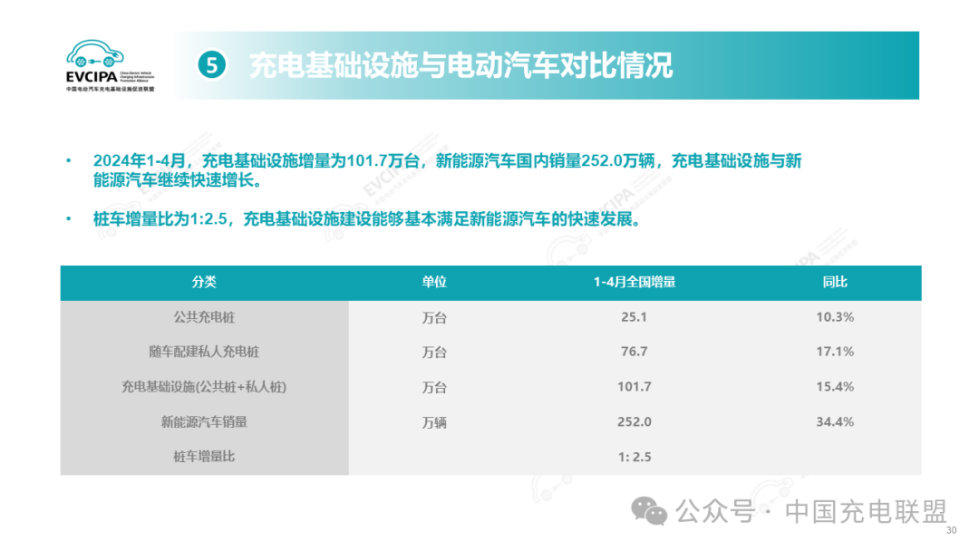 充电基础设施与电动汽车对比情况,2024年1-4月,充电基础设施增量为101.7万台,新能源汽车国内销量252.0万辆,充电基础设施与新能源汽车继续快速增长。桩车增量比为1:2.5,充电基础设施建设能够基本满足新能源汽车的快速发展。