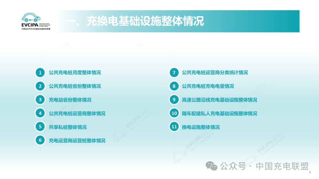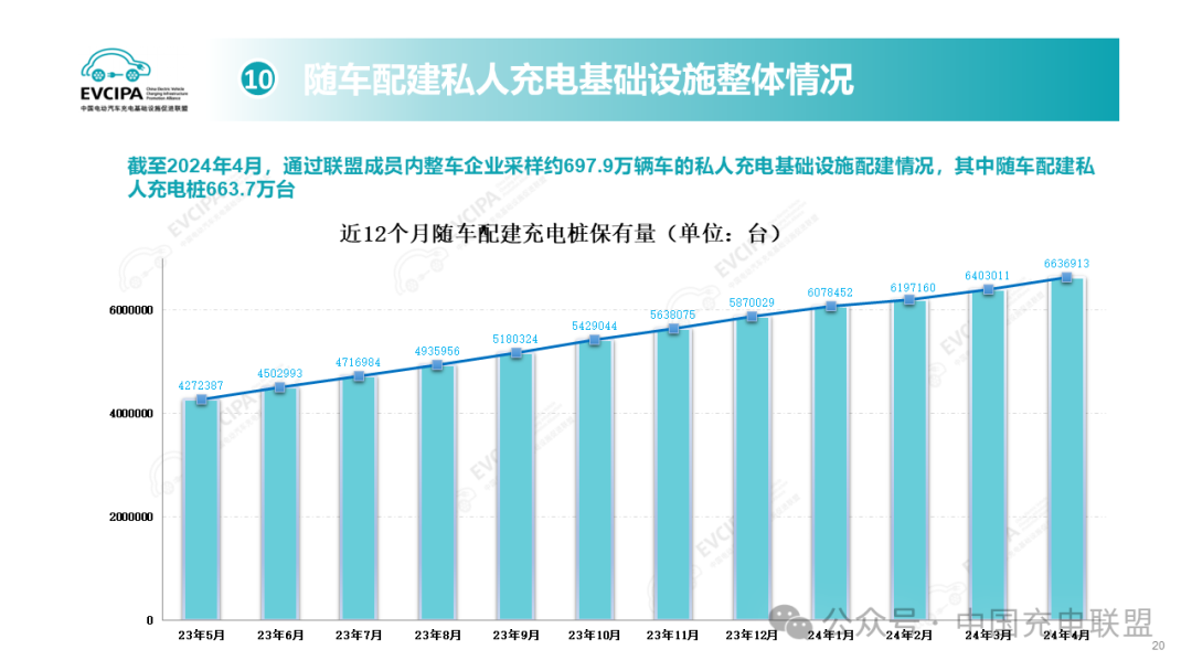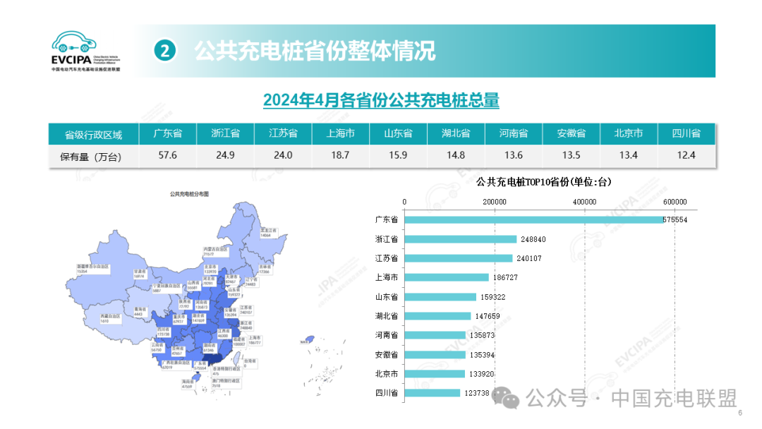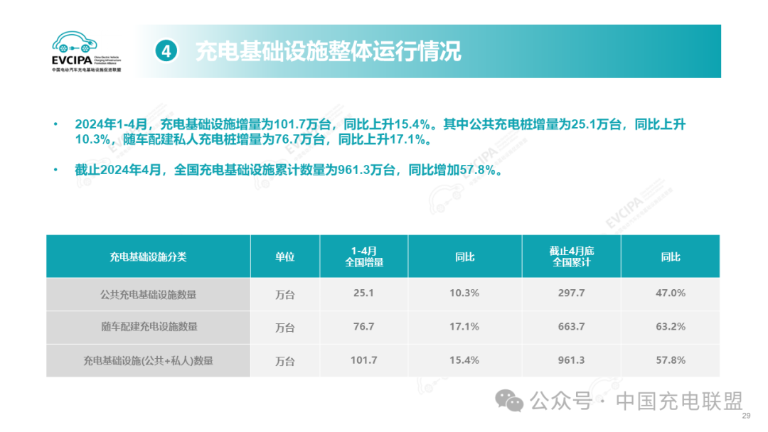 充电基础设施整体运行情况,2024年1-4月,充电基础设施增量为101.7万台,同比上升15.4%。其中公共充电桩增量为25.1万台,同比上升10.3%,随车配建私人充电桩增量为76.7万台,同比上升17.1%。截止2024年4月,全国充电基础设施累计数量为961.3万台,同比增加57.8%。