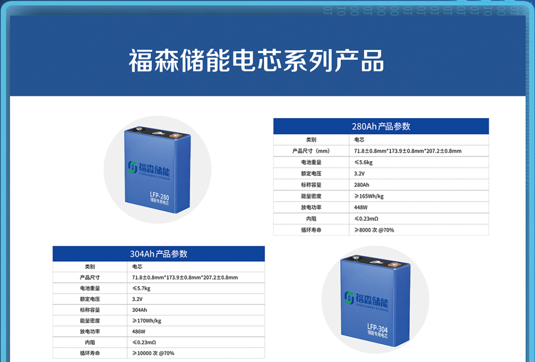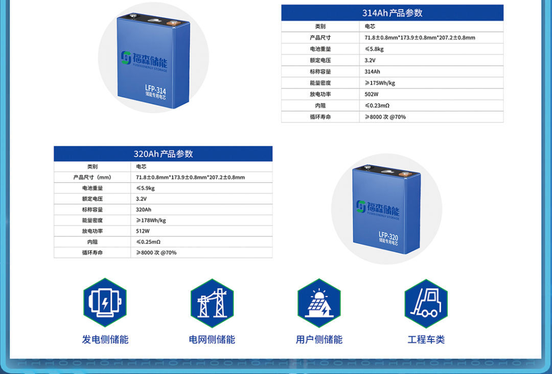 > 福森储能280Ah、304Ah、314Ah、320Ah的储能专用电芯,满足不同用户需求,并从高安全材料、卷芯控制、电芯测试、系统安全等各方面出发,保证电芯的高安全性能。>