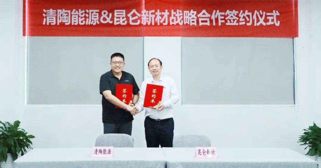 签约仪式在清陶能源总部昆山举行。>清陶能源总经理李峥与> 昆仑新材董事长郭营军>