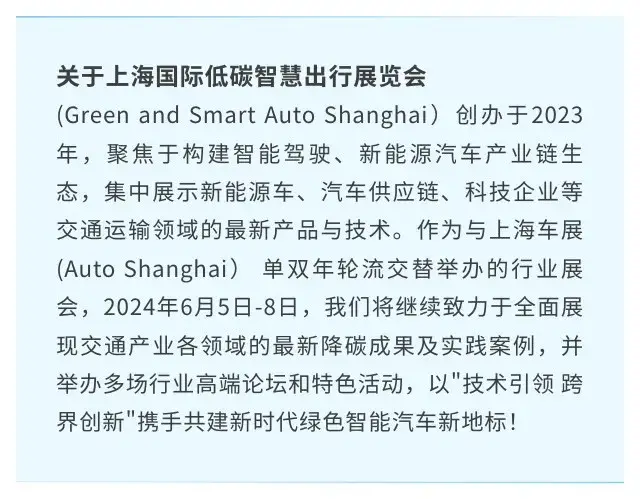 >>展低碳智慧出行技术,览绿色交通融合创新!6月5日-8日,2024上海国际低碳智慧出行展览会(GSA 2024)期待您的到来!> >