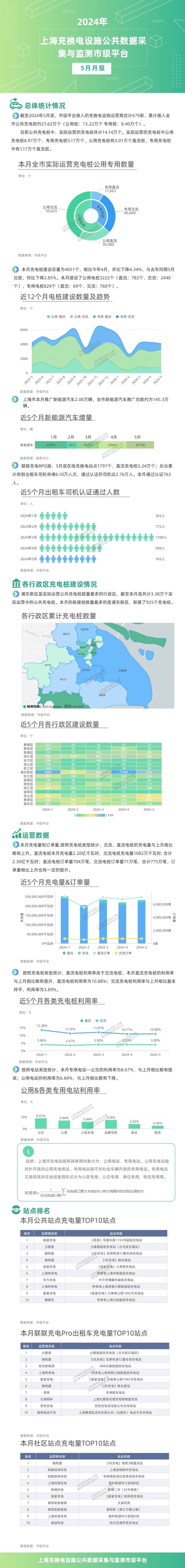 >2024年5月底,市级平台接入的充换电设施运营商总计679家。市级平台累计接入全市的公用及专用充电桩共计21.62万个。目前公共充电桩中,实际运营的充电桩共计14.14万个,其中公用充电桩8.97万个、专用充电桩5.17万个,公用充电桩有3.01万个直流桩、专用充电桩中有1.17万个直流桩。本月推广新能源车2.08万辆,全市新能源车辆累计推广145.3万辆。>