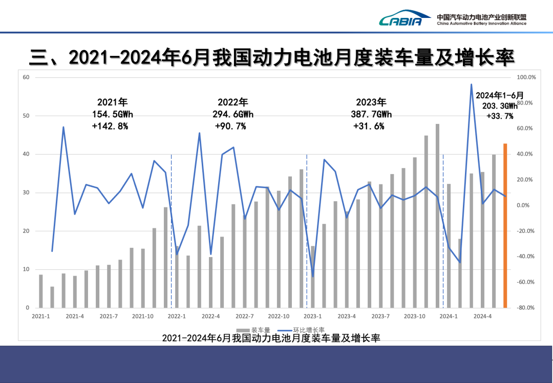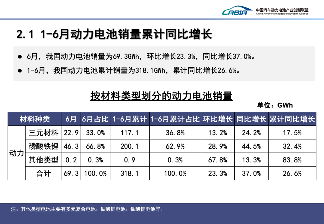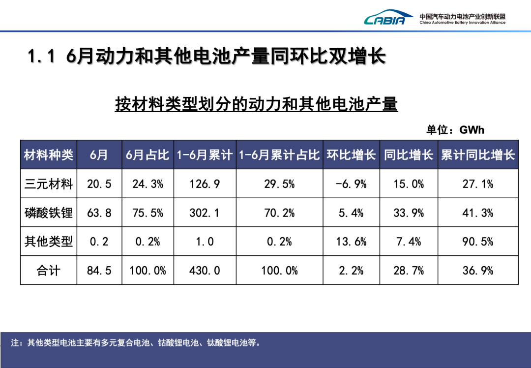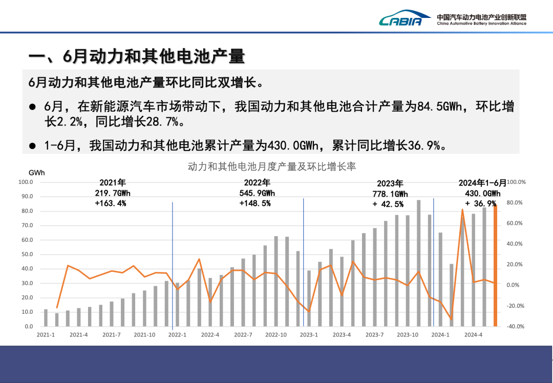 > 6月,在新能源汽车市场带动下,我国动力和其他电池合计产量为84.5GWh,环比增长2.2%,同比增长28.7%>。> 1-6月,我国动力和其他电池累计产量为430.0GWh,累计同比增长36.9%。>