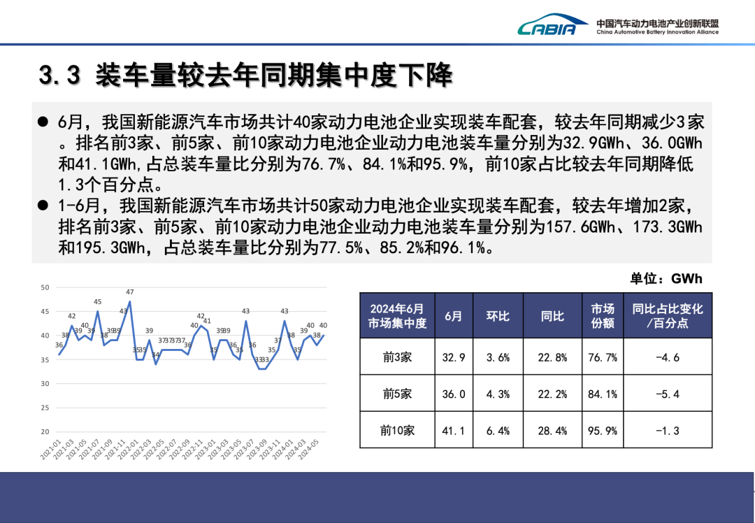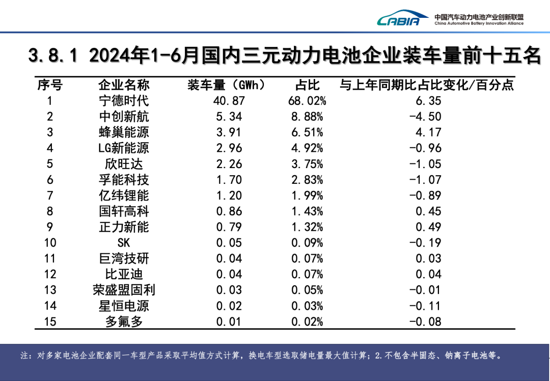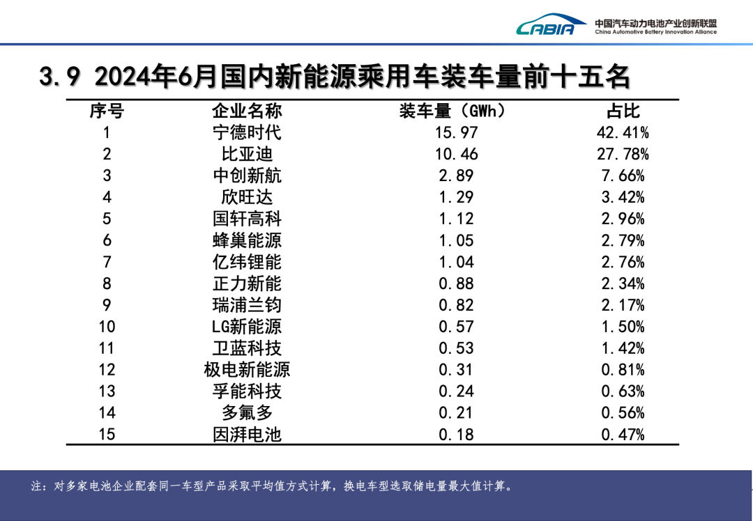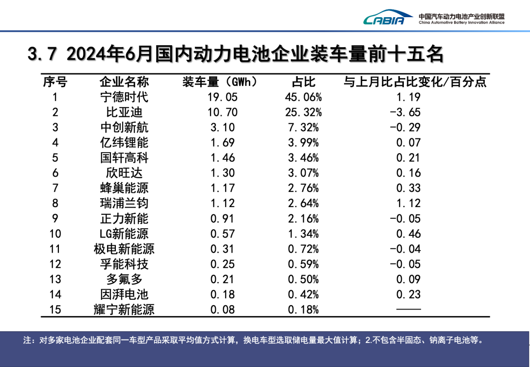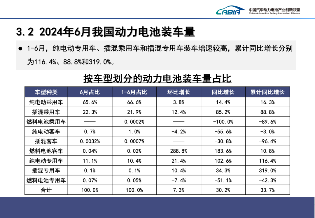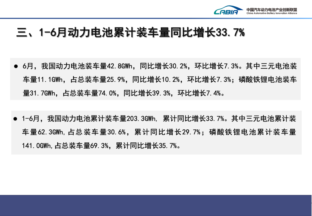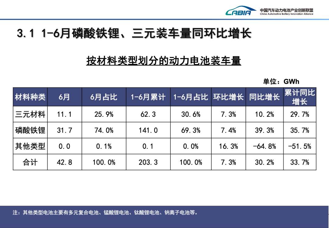 >>6月,我国动力电池装车量42.8GWh,同比增长30.2%,环比增长7.3%。其中三元电池装车量11.1GWh,占总装车量25.9%,同比增长10.2%,环比增长7.3%;磷酸铁锂电池装车量31.7GWh,占总装车量74.0%,同比增长39.3%,环比增长7.4%>。> >