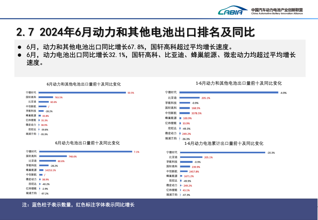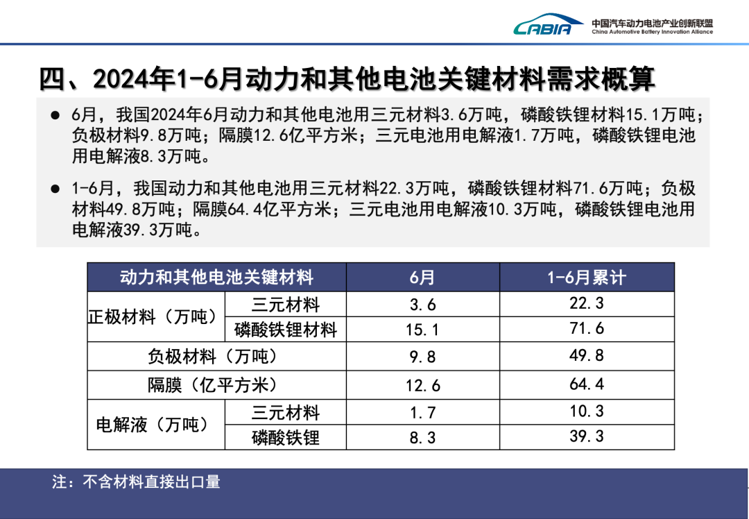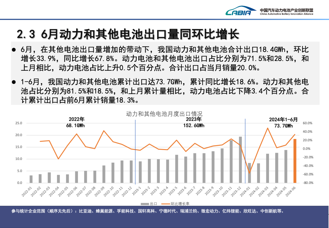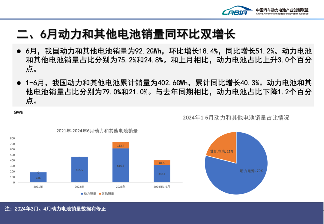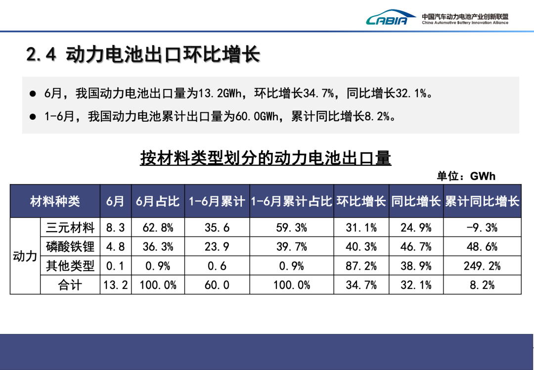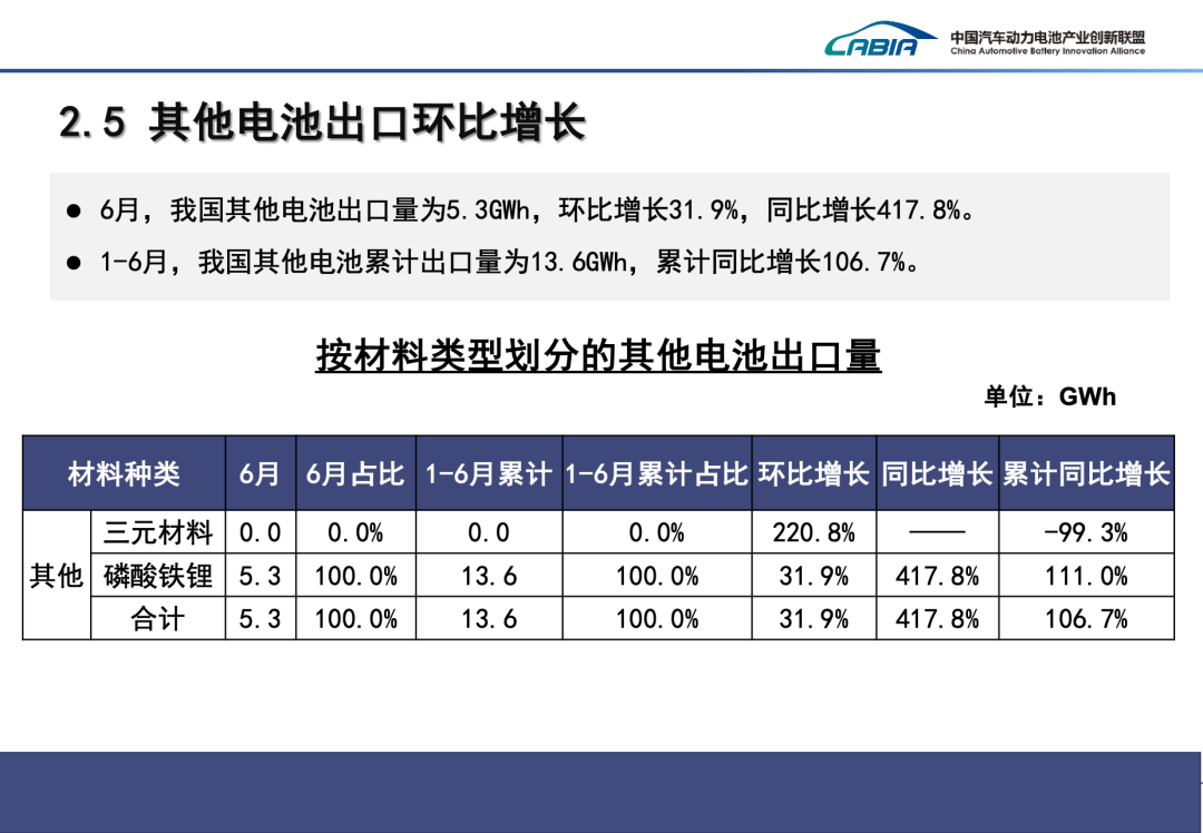 > 6月,我国动力和其他电池销量为92.2GWh,环比增长18.4%,同比增长51.2%。其中,>动力电池销量为69.3GWh,环比增长23.3%,同比增长37.0%;>其他电池销量为22.9GWh,环比增长5.5%,同比增长120.7%。>动力电池和其他电池销量占比分别为75.2%和24.8%。和上月相比,动力电池占比上升3.0个百分点。> 1-6月,我国动力和其他电池累计销量为402.6GWh,累计同比增长40.3%。其中,>动力电池累计销量为318.1GWh,累计同比增长26.6%;>其他电池累计销量为84.5GWh,累计同比增长137.3%>。>动力电池和其他电池销量占比分别为79.0%和21.0%。与去年同期相比,动力电池占比下降1.2个百分点。> 6月,在其他电池出口量增加的带动下,我国动力和其他电池合计出口18.4GWh,环比增长33.9%,同比增长67.8%,>合计出口占当月销量20.0%。>其中,>动力电池出口量为13.2GWh,环比增长34.7%,同比增长32.1%;>其他电池出口量为5.3GWh,环比增长31.9%,同比增长417.8%。>动力电池和其他电池出口占比分别为71.5%和28.5%,和上月相比,动力电池占比上升0.5个百分点。> 1-6月,我国动力和其他电池累计出口达73.7GWh,累计同比增长18.6%,>合计累计出口占前6月累计销量18.3%>。>其中,>动力电池累计出口量为60.0GWh,累计同比增长8.2%;>其他电池累计出口量为13.6GWh,累计同比增长106.7%。>动力和其他电池占比分别为81.5%和18.5%,和上月累计量相比,动力电池占比下降3.4个百分点。>