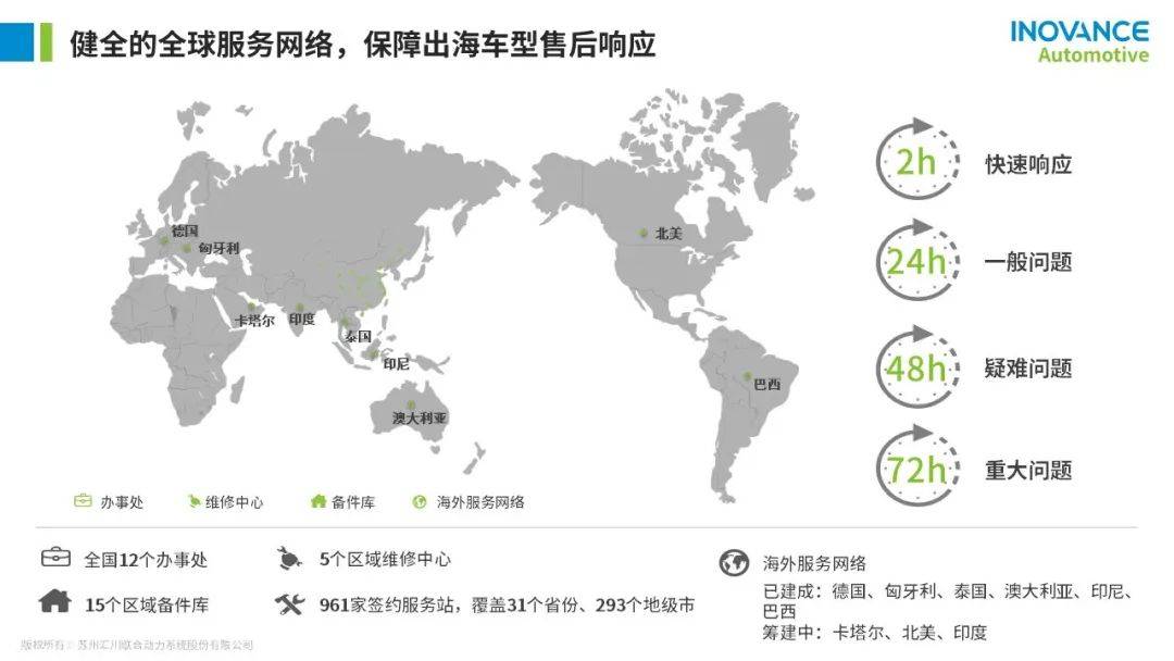 汇川联合动力在全球多地建立服务中心,确保能够迅速响应客户的售后服务需求,未来也将进一步拓展服务网络。汇川联合动力在国内拥有完善的售后服务体系,包括办事处、维修中心、备件库和签约服务站,可实现售后问题2h快速响应,重大问题72h高效处理的服务。在国外,已完成6大海外服务基地建立,计划筹建3家。通过这一健全的全球服务网络,汇川联合动力能够高效地保障出海车型的售后响应,为国内客户快速出海提供强有力的支持。通过产品搭载客户车型出海,助力多家国内头部车型品牌的拓展海外市场机遇。>