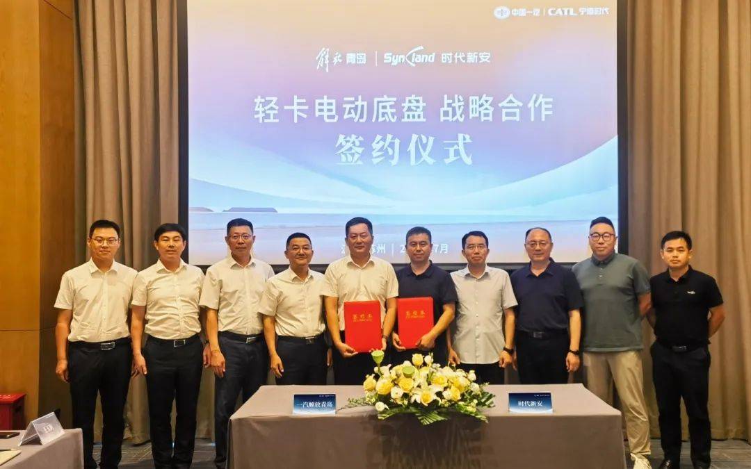 7月15日,一汽解放青岛汽车有限公司与宁德时代子公司时代新安在苏州签署战略合作协议,旨在深化双方在新能源滑板底盘的合作。一汽解放青岛副总经理王玉海、时代新安总经理胡建国、宁德时代集团三电总工刘明辉出席签约仪式,一汽解放青岛轻型车产品线开发院院长张翔和时代新安电动底盘工程>研究院>副院长王宇代表双方签约。>