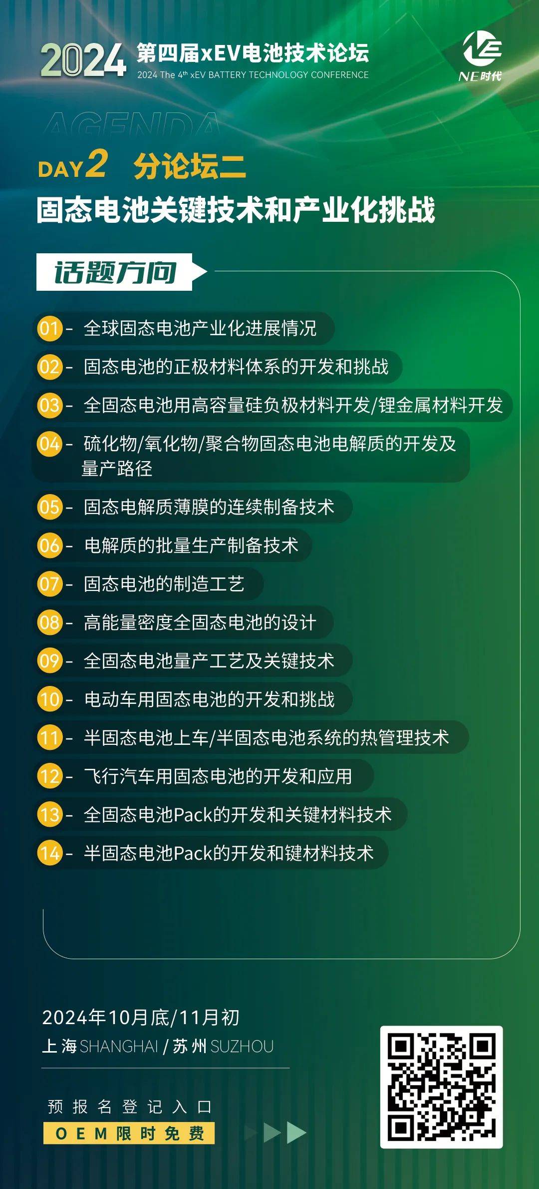 新能源汽车动力电池市场的发展战略和技术趋势是一个多维度的议题,它不仅涉及到技术本身的进步,还包括市场趋势、政策导向、供应链管理以及全球化布局等关键要素,本次>“>2024年第四届xEV电池技术论坛>“ 将以新能>源汽车动力电池市场发展战略和技术趋势为主题,>围绕新能源汽车>动力电池市场战略>、>技术趋势>,以及>固态电池产业发展>,展开深度对话,共同探索未来市场的形态与机遇。>