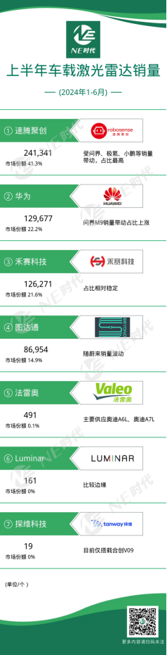 > > >>NE时代统计数据,速腾聚创激光雷达搭载量为24.13万台,市占率为第一,达到41.3%。> > >