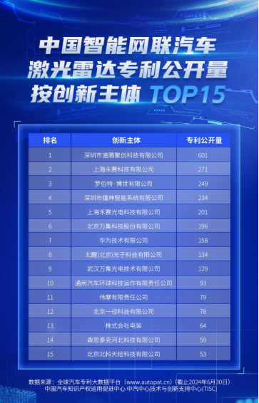 >>近日,在中汽信息科技有限公司(下称中汽信科)、中国汽车知识产权运用促进中心、中汽中心技术与创新支持中心(TISC)联合发布的《中国智能网联汽车激光雷达专利公开量按创新主体TOP15》排行榜中,速腾聚创以601项专利公开量遥居首位,展现出全球顶尖的技术创新实力。> > >