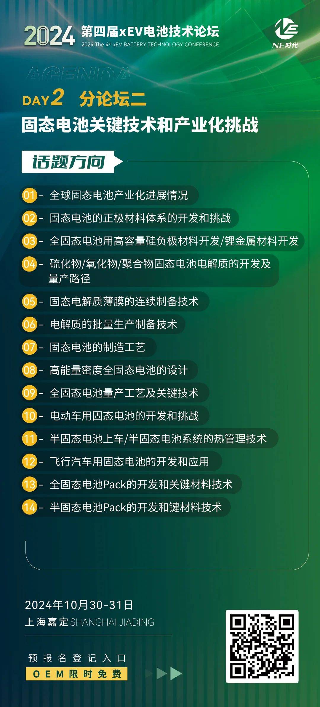 新能源汽车动力电池市场的发展战略和技术趋势是一个多维度的议题,它不仅涉及到技术本身的进步,还包括市场趋势、政策导向、供应链管理以及全球化布局等关键要素,本次>“>2024年第四届xEV电池技术论坛>“ 将以新能>源汽车动力电池市场发展战略和技术趋势为主题,>围绕新能源汽车>动力电池市场战略>、>技术趋势>,以及>固态电池产业发展>,展开深度对话,共同探索未来市场的形态与机遇。>