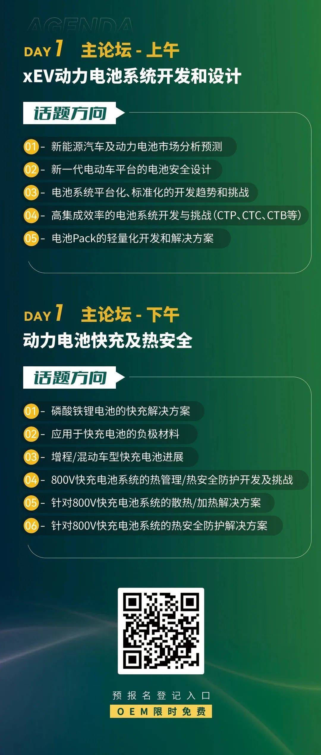 为期两天的论坛将深度聚焦新能源动力市场电池及发展趋势与政策分析。>聚焦动力电池快充及热安全,涵盖磷酸铁锂电池的快充解决方案,应用于快充电池的负极材料,以及针对800V快充电池系统的散热/加热和热安全防护解决方案。>