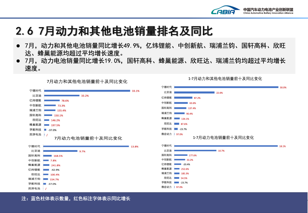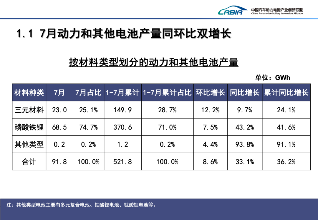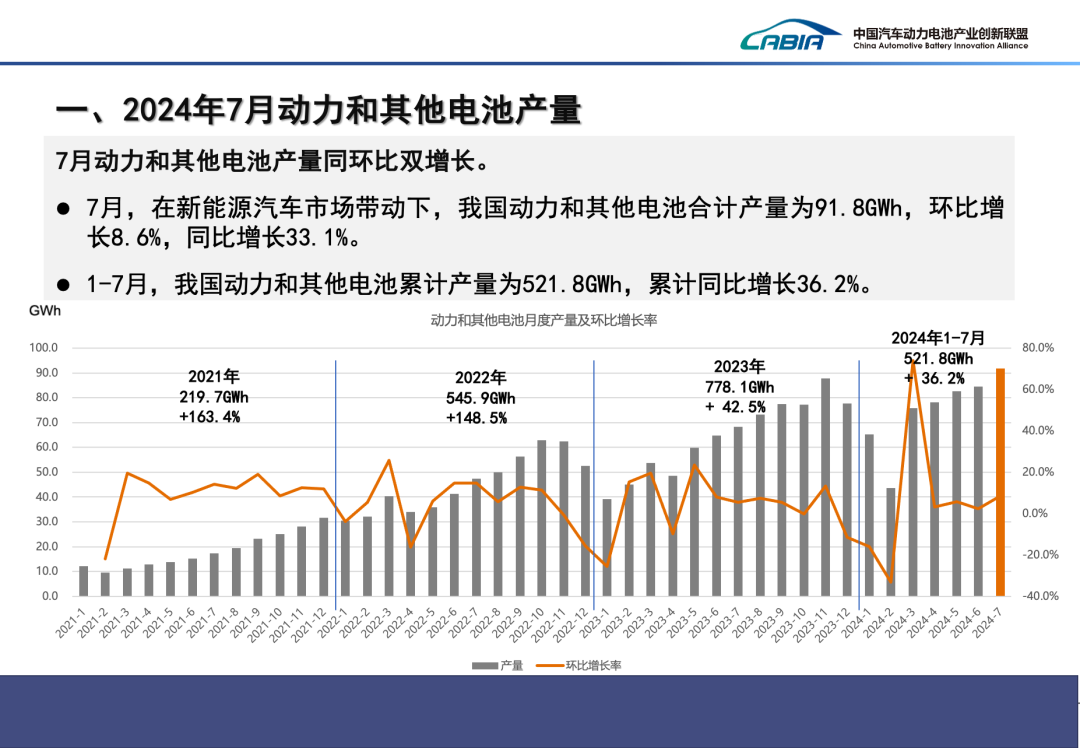 > 7月,在新能源汽车市场带动下,我国动力和其他电池合计产量为91.8GWh,环比增长8.6%,同比增长33.1%。> 1-7月,我国动力和其他电池累计产量为521.8GWh,累计同比增长36.2%。>