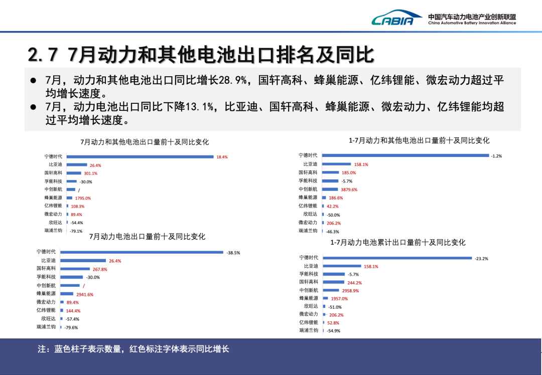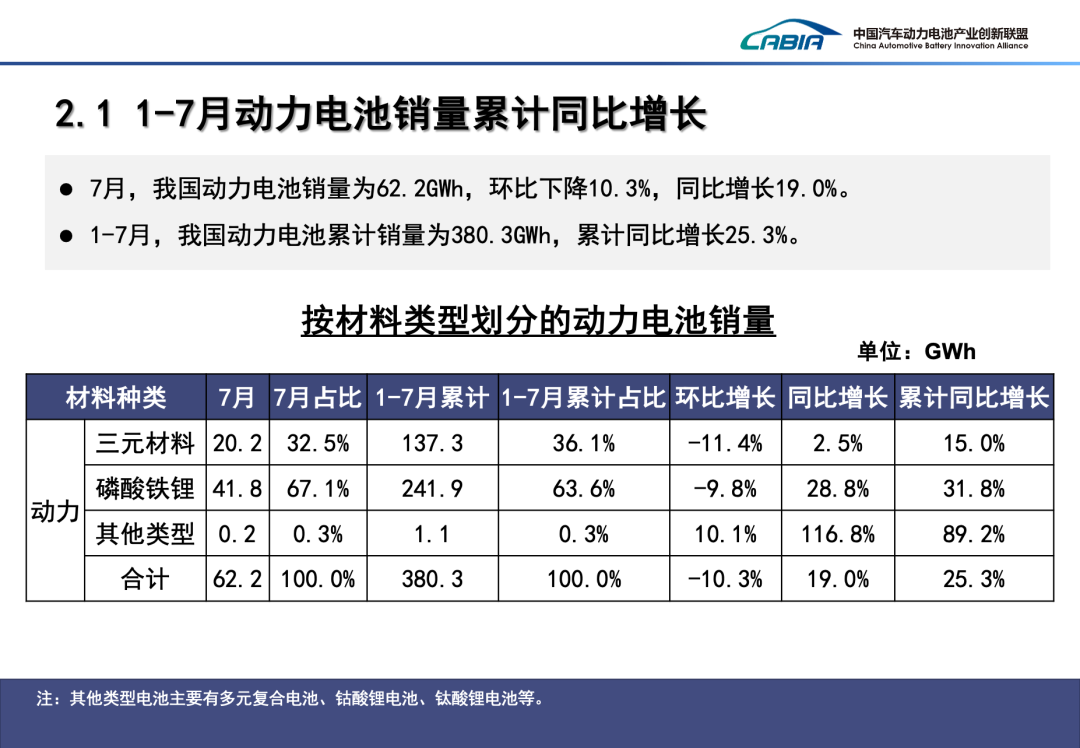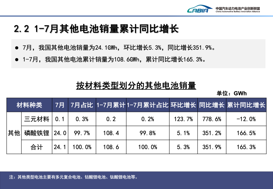 > 7月,我国动力和其他电池销量为86.3GWh,环比下降6.4%,同比增长49.9%。其中,>动力电池销量为62.2GWh,环比下降10.3%,同比增长19.0%,占总销量>72.1%,和上月>相比,占比下降了3.1个百分点;>其他电池销量为24.1GWh,环比增长5.3%,同比增长351.9%,占总销量>27.9%。> 1-7月,我国动力和其他电池累计销量为488.9GWh,累计同比增长41.9%。其中,>动力电池累计销量为380.3GWh,累计同比增长25.3%,>占总累计销量>77.8%,>与去年同期相比,占比下降1.2个百分点;>其他电池累计销量为108.6GWh,累计同比增长165.3%,占总累计销量的>22.2%。> 7月,我国动力和其他电池合计出口15.6GWh,环比下降15.5%,同比增长28.9%,合计出口占当月销量18.0%。其中,>动力电池出口量为9.6GWh,环比下降27.2%,同比下降13.1%,占总出口量的>61.5%,和上月相比,占比下降10.0个百分点>;>其他电池出口量为6.0GWh,环比增长13.9%,同比增长471.6%,占总出口量的>38.5%。>>> 1-7月,我国动力和其他电池累计出口达89.2GWh,累计同比增长28.9%,合计累计出口占前7月累计销量18.3%。其中,>动力电池累计出口量为69.6GWh,累计同比增长5.2%,占合计累计出口量的>78.0%,>和上月累计量相比,动力电池占比下降3.5个百分点>;>其他电池累计出口量为19.6GWh,累计同比增长153.7%,占合计累计出口量的>22.0%。>