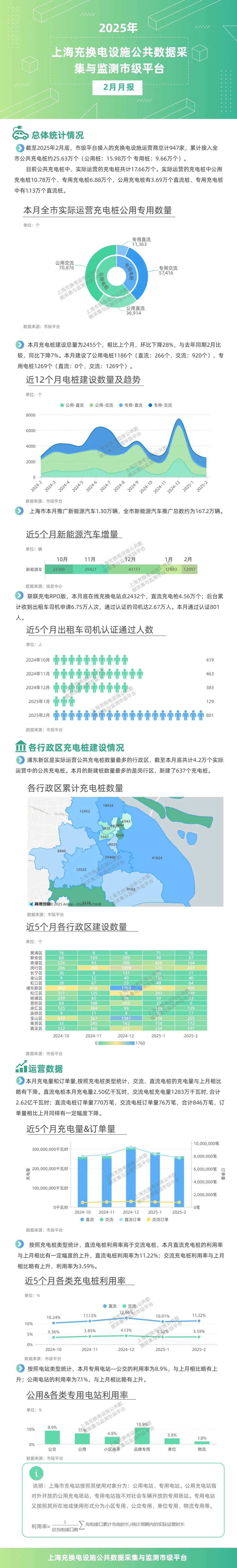 2025年2月底,市级平台接入的充换电设施运营商总计947家。市级平台累计接入全市的公用及专用充电桩共计25.63万个。目前公共充电桩中,实际运营的充电桩共计17.66万个,其中公用充电桩10.78万个、专用充电桩6.88万个,公用充电桩有3.69万个直流桩、专用充电桩中有1.13万个直流桩。本月推广新能源车1.30万辆,全市新能源车辆累计推广167.2万辆。>