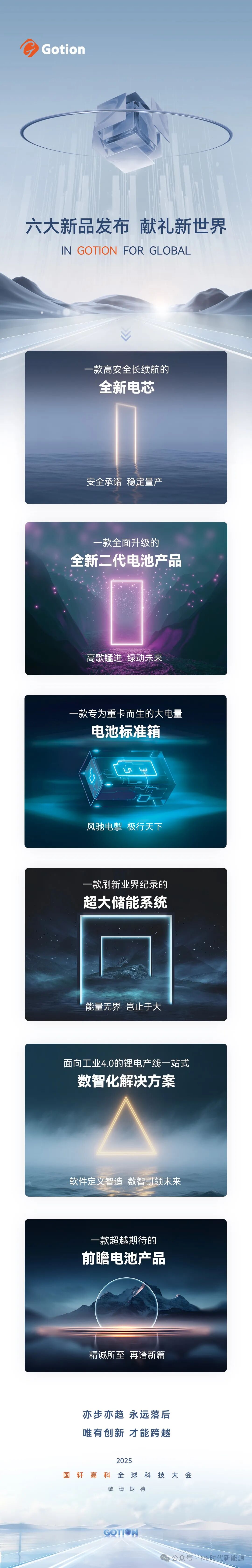 >第一款新品是一款高安全长续航的全新电芯,主打安全和稳定量产。第二款新品是一款全面升级的全新二代电池产品,从宣传语“高歌锰进,绿动未来”来看,这是一款高锰产品。第三款新品是专为重卡而生的大电量电池标准箱。第四款新品是超大储能系统。第五款新品是面向工业4.0的锂电产线一站式数智化解决方案。最后一款新品,国轩高科并未透露其应用场景,而是称其为一款超越期待的前瞻电池产品。>