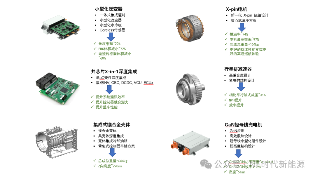 >联合电子研发的全新一代的深度集成同轴多合一电桥产品。该产品深度集成联合电子X pin电机、行星排减速箱、小型化逆变器、GaN CharCON、>PDU>、VCU,具有小尺寸、低重量、高功率密度、高集成度的显著优势。>