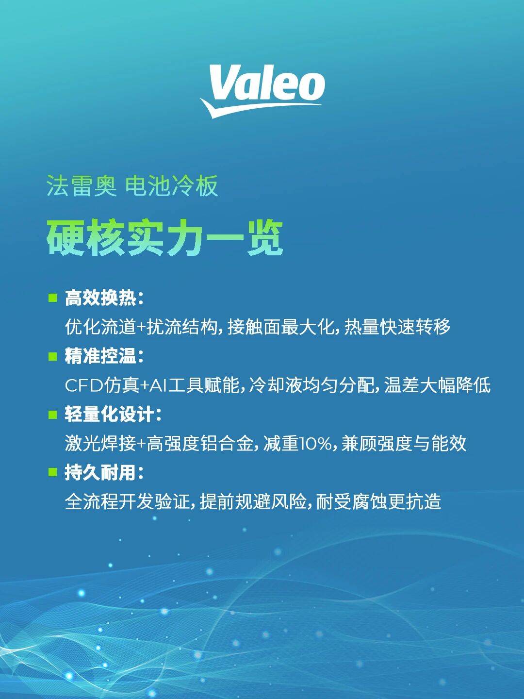 更新于: 2026-01-19 11:33:26电池冷板是新能源热管理系统中的核心零件,主要功能是作为热交换器,和动力电池紧密贴合,通过内部流道循环的冷却介质,精准控制电池工作温度,保证电池系统的安全,延长电池的使用寿命。 作为汽车热管理领域的领导者,法雷奥在该领域已深耕二十余年。其电池冷板产品能够精准应对行业关键痛点,以领先的热管理技术助力汽车电动化与智能化进程加速迈进。