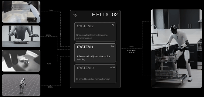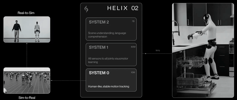 Helix 02以“三层系统架构”给出了全新解决方案,在原有System 1与System 2基础上新增核心基础层System 0,三者各司其职且高效协同,构建起从视觉像素到关节扭矩的完整控制链路。
