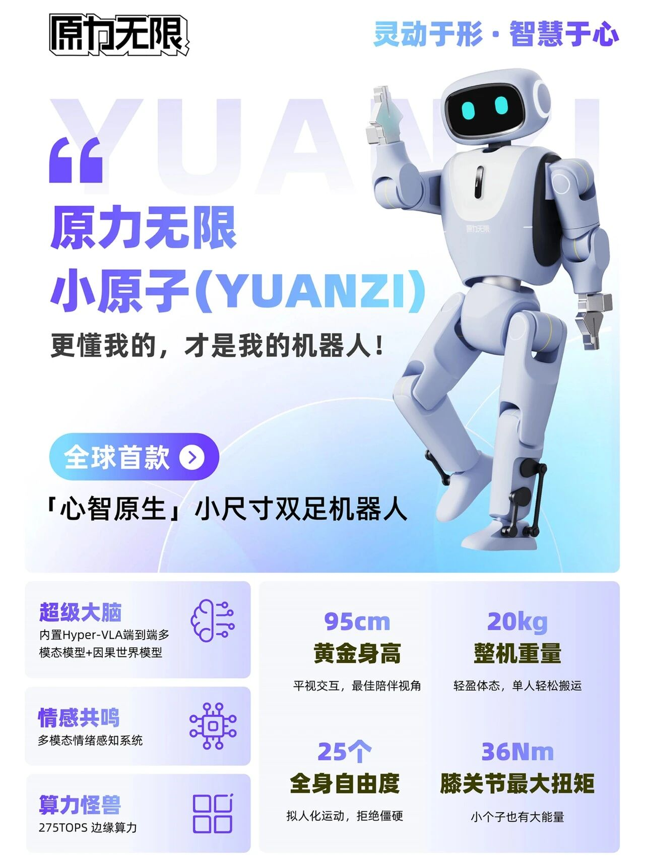 2月4日,原力无限正式推出旗下首款消费级具身智能新品——「小原子」(YUANZI),该产品被定义为全球首款“心智原生”小尺寸双足机器人,同步在原力无限·京东自营旗舰店开启预售。在2026年具身智能赛道普遍聚焦硬件参数比拼的行业背景下,原力无限突破传统娱乐型机器人定位,以“心智原生”为核心导向,推动消费级具身智能从“能动”向“懂你”的核心进化,打造面向未来家庭的智能陪伴新物种,区别于市场上单纯具备动作展示功能的“科技玩具”。「小原子」采用95厘米人机交互黄金尺度的小尺寸双足人形设计,整机重量20kg,配备25个全身自由度,可灵活适配家庭日常空间。该产品具备可进化特性,硬件端搭载通用外设接口,支持关键部件快速替换及3D打印外设即插即用,实现功能场景灵活拓展;软件端通过官方OTA升级及开放平台持续迭代,可不断拓宽能力边界。「小原子」内置全栈自研的Hyper-VLA端到端多模态模型与因果世界模型深度融合,接入阿里云千问大模型,边缘算力达275 TOPS,具备持续学习能力,可精准捕捉用户需求实现个性化陪伴同时,原力无限计划推出“原力市集”零代码应用开发平台,构建具身智能领域首个面向个人用户的社群生态,让用户可自主定义机器人,实现每一台「小原子」的独一无二。