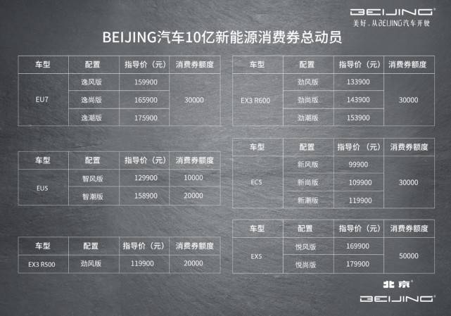 优惠券适用车型为EU7、EU5、EX3 R500、EX3 R600、EX5与EC5这6款车型,最高优惠可达5万元。消费者在BEIJING汽车京东、天猫旗舰店即可领取消费券,在购车时可直接抵作现金用。