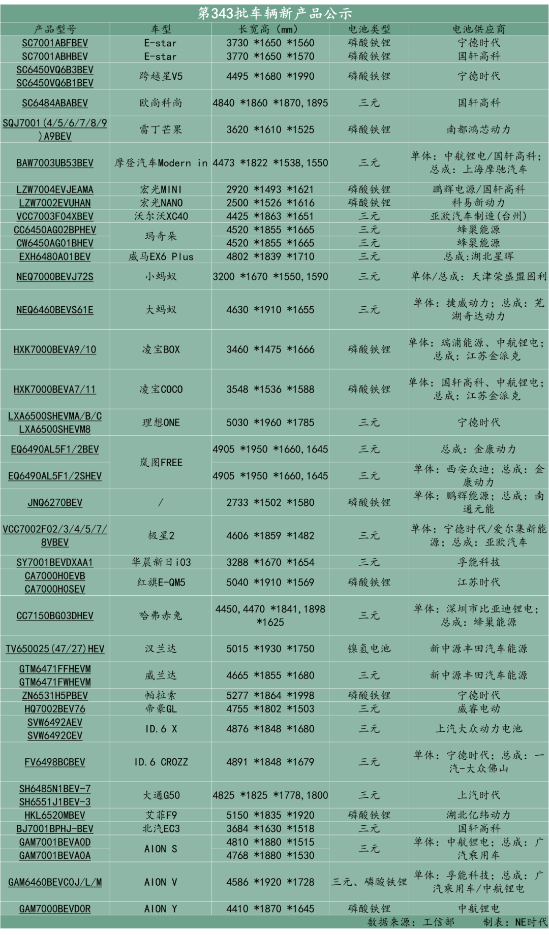 4月12日,工信部发布了最新一批的新车目录(第343批),其中新能源乘用车共67款(部分车型重叠),其中镍氢电池三款,磷酸铁锂电池25款,三元锂电池39款。此外,此次申报的车型中有11款是微型车。>