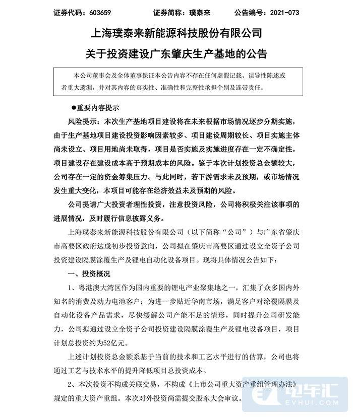 电车汇消息:7月7日,璞泰来发布公告称,公司与广东省肇庆市高要区政府达成初步投资意向,公司拟在肇庆市高要区通过设立全资子公司投资建设隔膜涂覆生产及锂电自动化设备项目,公司将通过设立全资子公司投资建设隔膜涂覆生产及锂电设备项目,项目计划总投资约为52亿元。