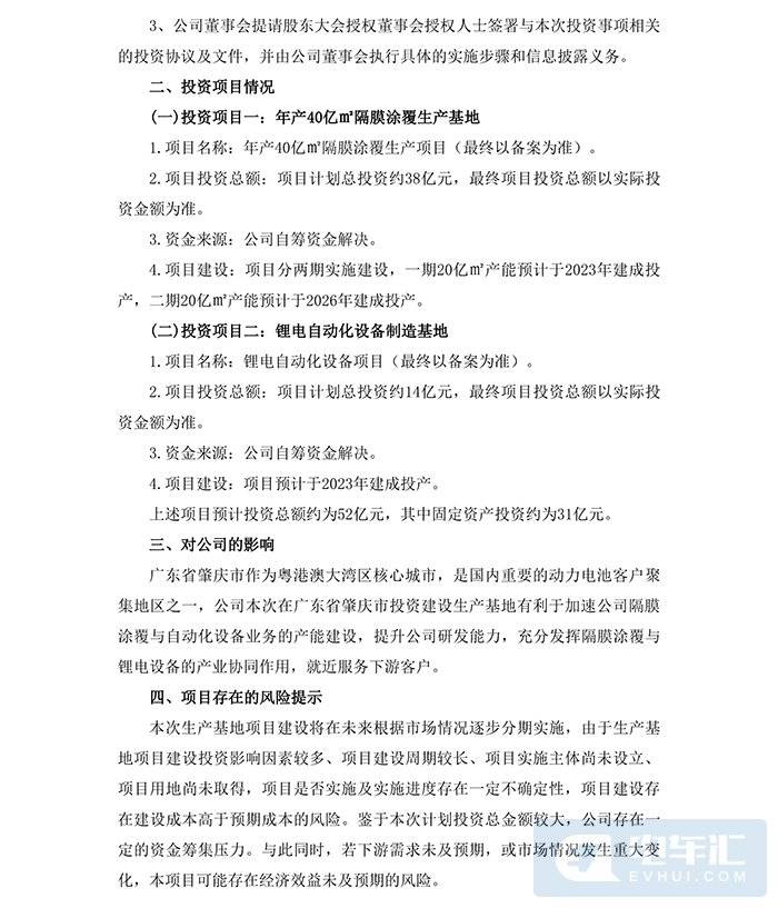 项目名称:年产40亿㎡隔膜涂覆生产项目(最终以备案为准),项目计划总投资约38亿元,最终项目投资总额以实际投资金额为准。项目分两期实施建设,一期20亿㎡产能预计于2023年建成投产,二期20亿㎡产能预计于2026年建成投产。