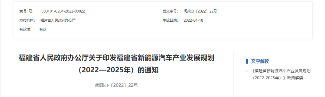 4月22日,福建省人民政府印发了《福建省新能源汽车产业发展规划(2022—2025年)的通知》(以下简称“《通知》”)