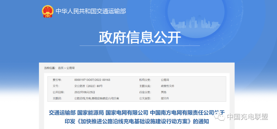 >为深入贯彻落实党中央、国务院决策部署,加快健全完善公路沿线充电基础设施,不断满足日益增长的电动汽车充电需求,服务公众便捷出行,促进电动汽车产业发展,交通运输部、国家能源局、国家电网有限公司、中国南方电网有限责任公司共同研究制定了《加快推进公路沿线充电基础设施建设行动方案》,现印发给你们,请结合本地区实际,认真组织实施。 >