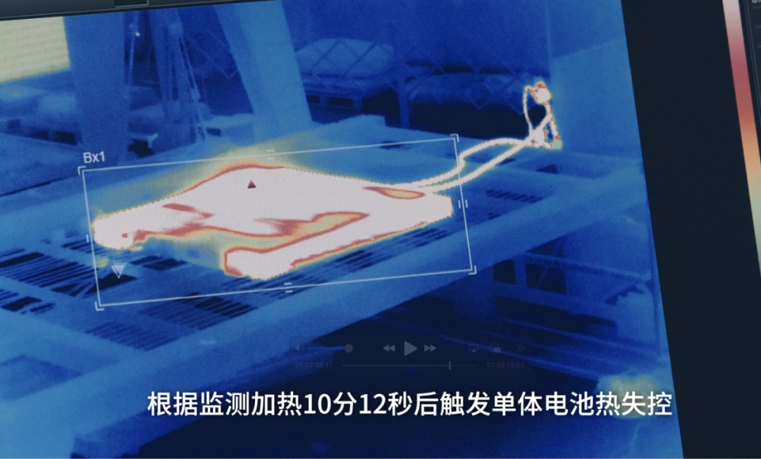 >在试验中,工程师选择电池包内中心位置的一个电池单体,使用加热装置通过直接接触的方式进行加热。根据监测,加热10分12秒后触发单体电池热失控,BMS同步发出报警信息,没有起火或爆炸发生,顺利通过“热扩散”试验。>