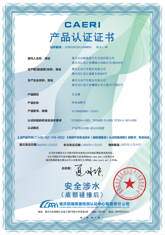 > >也因此,长安深蓝SL03成功获得“电动汽车安全涉水(底部碰撞后)”001号认证。>