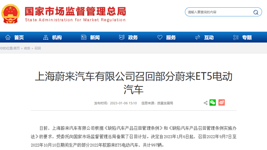 日前,上海蔚来汽车有限公司根据《缺陷汽车产品召回管理条例》和《缺陷汽车产品召回管理条例实施办法》的要求,受委托向国家市场监督管理总局备案了召回计划。决定自2023年1月6日起,召回2022年9月7日至2022年10月10日期间生产的部分2022年款蔚来ET5电动汽车,共计997辆。