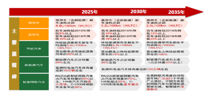 基于汽车技术发展的社会愿景和产业愿景,《节能与新能源汽车技术路线图 2.0》对节能减排提出新的节点要求。分别以 2025 年、2030年、2035 年为关键节点,设立了产业总体发展里程碑,预计到 2035 年节能汽车与新能源汽车年销售量占比达到 50%,汽车产业实现电动化转型、燃料电池汽车保有量将达到 100 万辆左右,商用车将实现氢动力转型。