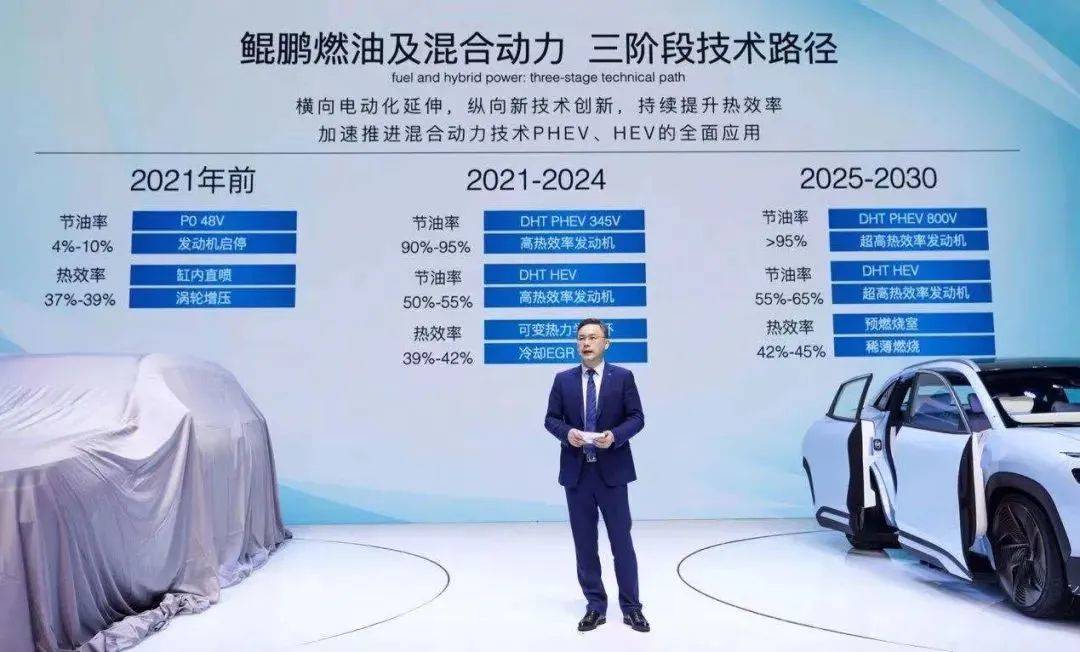 奇瑞汽车将通过三个阶段技术创新,加速推进混合动力技术PHEV、HEV的全面运用。鲲鹏动力到2025-2030第三个阶段,通过预燃烧室、稀薄燃烧等先进技术的应用,鲲鹏燃油发动机的热效率最高可达到45%,届时与之相匹配的鲲鹏DHT节油率最高将实现65%(HEV)。