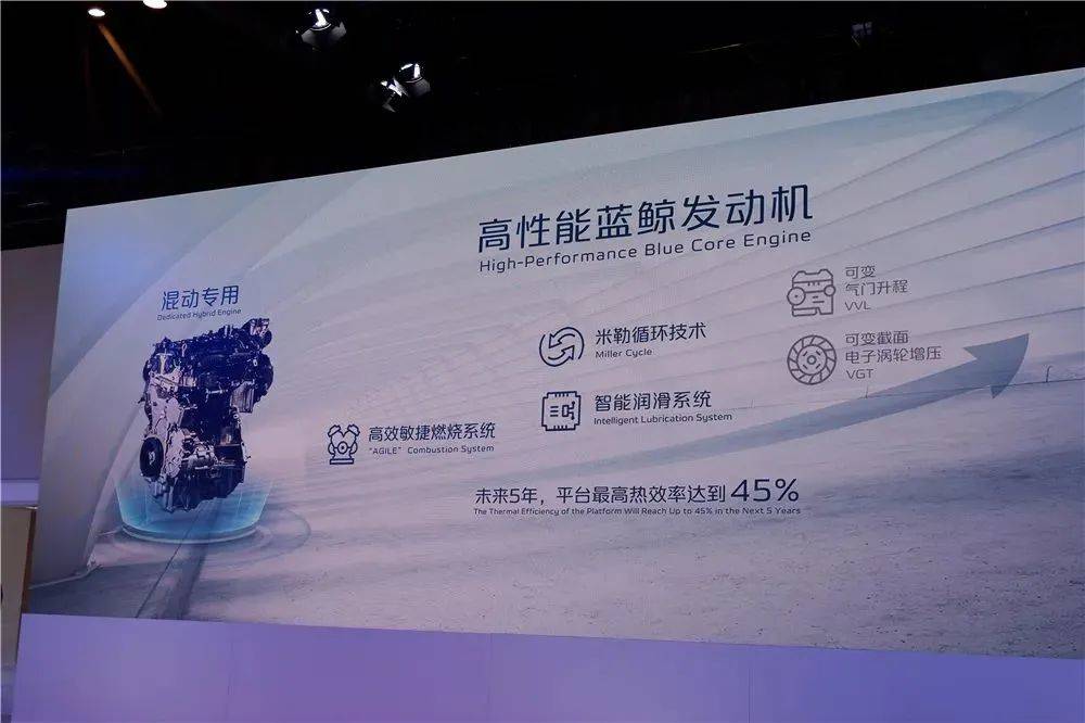该混动系统以蓝鲸1.5T发动机为基础,最高可释放125千瓦的功率,最大扭矩为260N·m,并加持了Agile敏捷燃烧系统,智能热管理系统,米勒循环、智能润滑系统等一系列新技术。随着应用可变气门升程,可变截面电子涡轮增压等一系列新技术即将加入,2025年前后,平台最高热效率可达到45%。