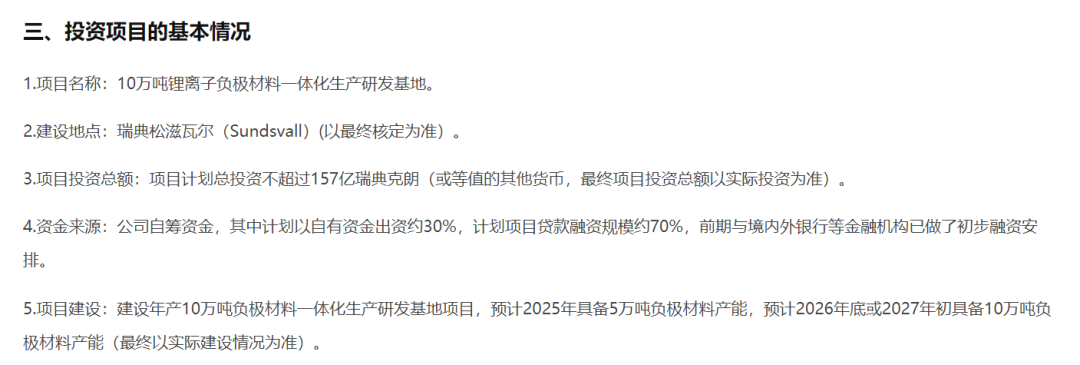 5月4日,璞泰来公告称,公司通过全资子公司璞泰来(新加坡)有限责任公司在瑞典投资设立紫宸科技(瑞典)有限责任公司,并开展瑞典10万吨锂离子负极材料一体化生产研发基地的建设工作,项目投资金额不超过157亿瑞典克朗。