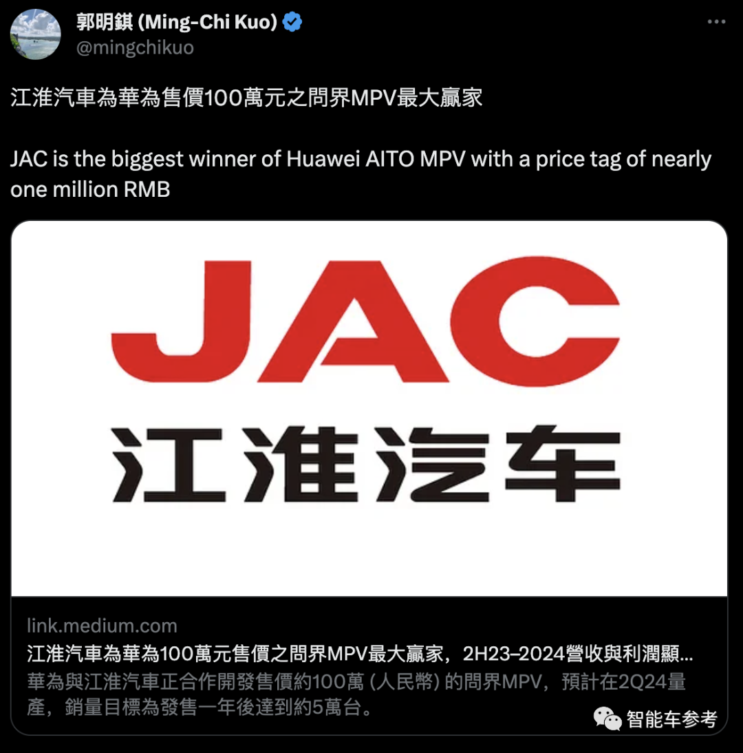 著名苹果爆料王、天风国际分析师郭明錤刚刚爆料,称华为和江淮汽车合作开发问界MPV,售价约为100万元。