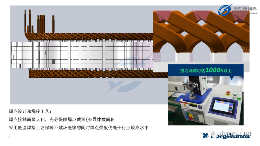 >>博格华纳称,经过无数实验对比,从十几种焊接工艺中,选定了低温纳米银合金作为X->Pin>的焊接技术,其特点是焊接温度低、浸润性好,导电性好,焊接强度高等,且焊接后不会烫伤漆膜,焊接后拉力可以达到1 000 N以上,完全能够满足X->Pin>的焊接要求。在经过反复的实验探索与改进,博格华纳已经完全掌握了低温纳米合金焊接技术,并制作了多台工程样机进行测试。> > >
