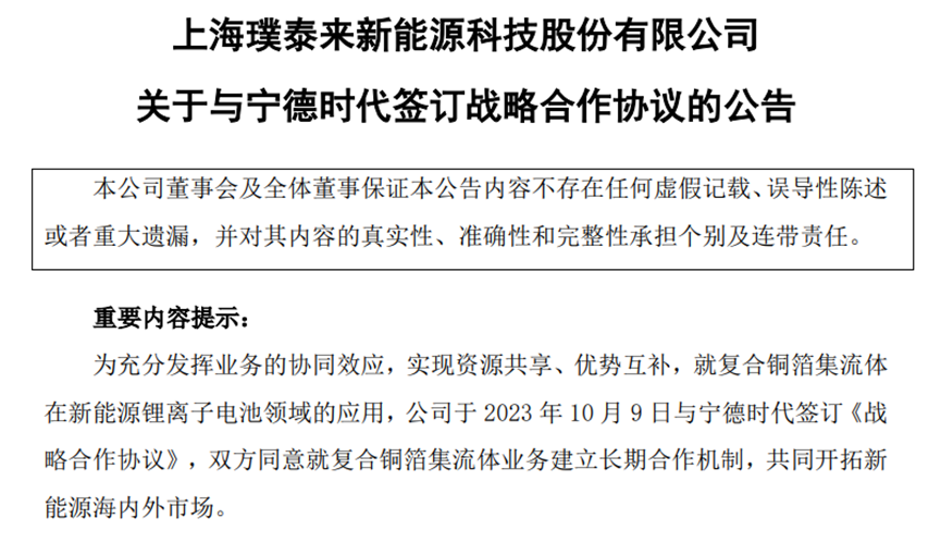 10月9日,璞泰来发布公告称,与宁德时代签订《战略合作协议》,双方同意就复合铜箔集流体业务建立长期合作机制,共同开拓新能源海内外市场。