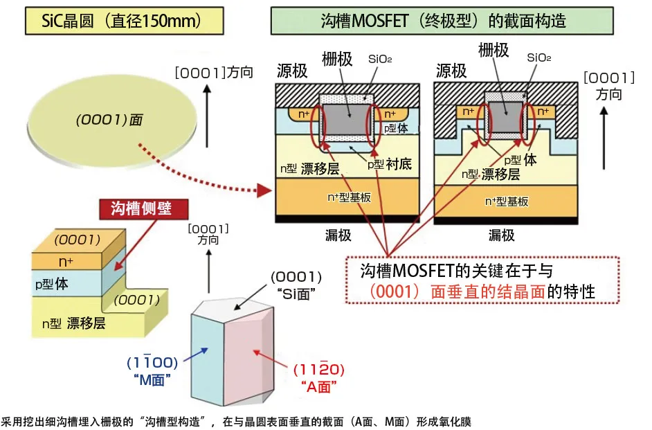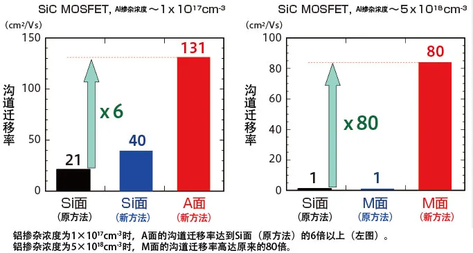 日本京都大学木本教授的科研团队,不仅提出了关于高质量栅氧化层的制作工艺,而且发现在制造沟槽型MOSFET时,选择与硅面(0001)垂直的A面或M面上形成栅氧化层,与传统的硅面成膜的工艺相比,沟道迁移率可以提高约6~7倍。