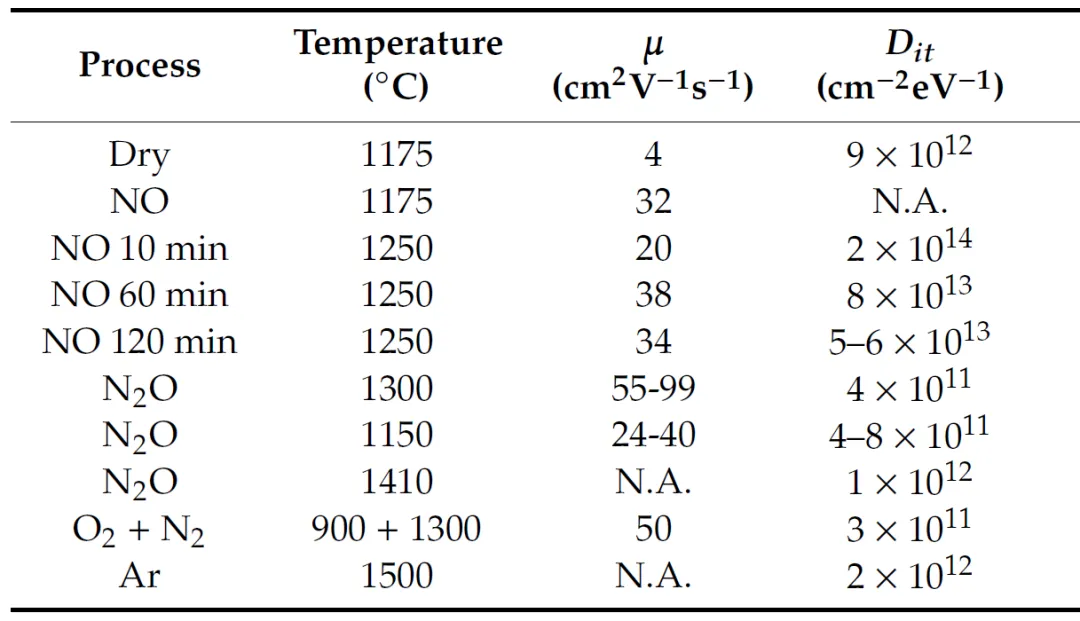 众所周知,退火工艺可以在一定程度上减少界面缺陷,降低界面陷阱密度,进而提升沟道迁移率。特别是在含氮氛围中退火,可以有效地将沟道迁移率提升6~12倍。