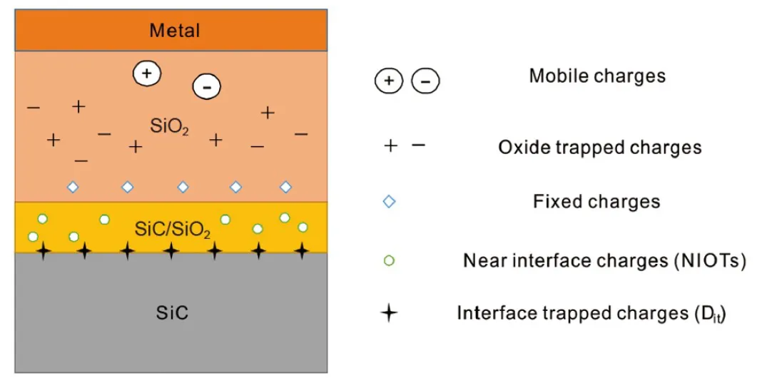 如上图所示,根据位置分布,通常将SiC/SiO2界面附近的缺陷分为,界面陷阱(Dit)、近界面氧化物陷阱(NIOTs)、固定电荷、氧化层陷阱及移动电荷。其中界面陷阱主要指位于碳化硅表面的陷阱,主要包括由于热氧化产生的含碳副产物缺陷、悬挂键和晶格失配等形成的陷阱。