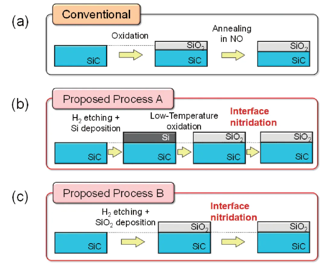 日本京都大学的木本恒畅科研团队,在2022年提出了一项关于制作高质量栅氧化层的工艺。大致流程如下:首先,通过氢刻蚀去除残留在碳化硅晶圆表面的缺陷;其次,分两种方式制作氧化层:一(Process A)是在晶圆表面先沉积一层硅薄膜,然后在750°C低温下进行氧化,可将其转换为SiO2薄膜。由于硅氧化的起始温度为700℃,而碳化硅的氧化起始温度为900℃,因此750℃仅氧化硅而不会氧化碳化硅。二(Process B)是使用化学气相沉积(CVD)方式直接沉积SiO2薄膜。