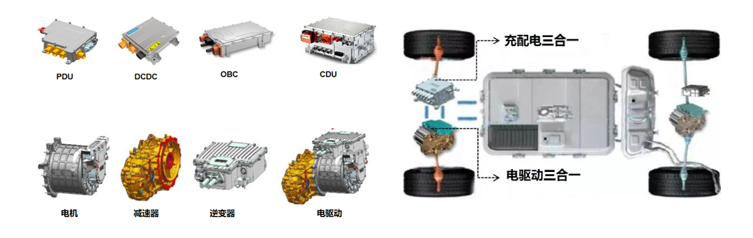 电驱集成化技术是新能源汽车技术发展的一个重要方向。该技术针对系统成本、体积、重量等方面均有一定提升。随着电力电子技术的不断成熟,电驱系统也从最初的“三合一”开始逐步向“六合一”,甚至“八合一”、“十二合一”的方向发展,与之对应的集成的模块种类和数量也在持续增加。为了方便区分,业内通常将“六合一”、 “八合一”等集成部件高于“三合一”的系统称之为多合一。