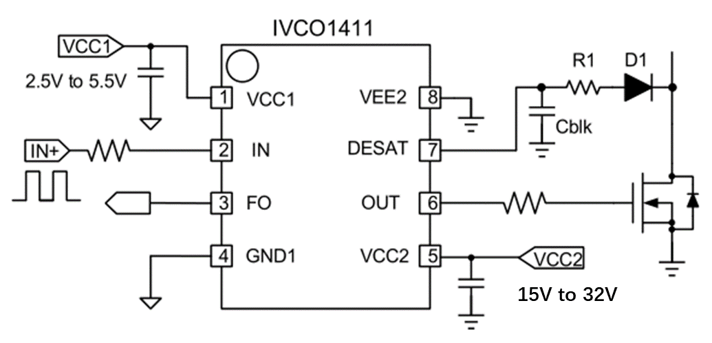 > >IVCO1411F集成>短路保护>功能,带有DESAT引脚;IVCO1411H的功能相同,区别在于欠压保护(UVLO)阈值更高。 >
