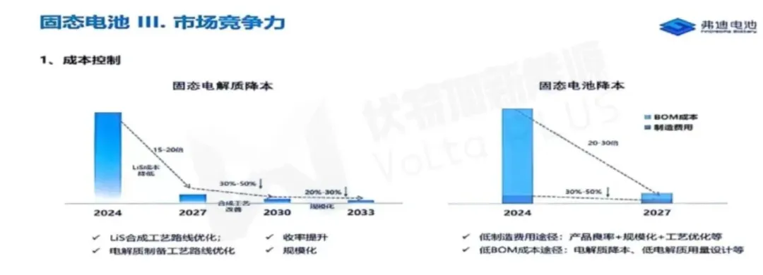 通过固态电解质降本后,整体材料BOM成本在2027年计划降本2000%-3000%,再通过提高产品良率+规模化效果+工艺优化等方式将制造成本降低30%-50%。