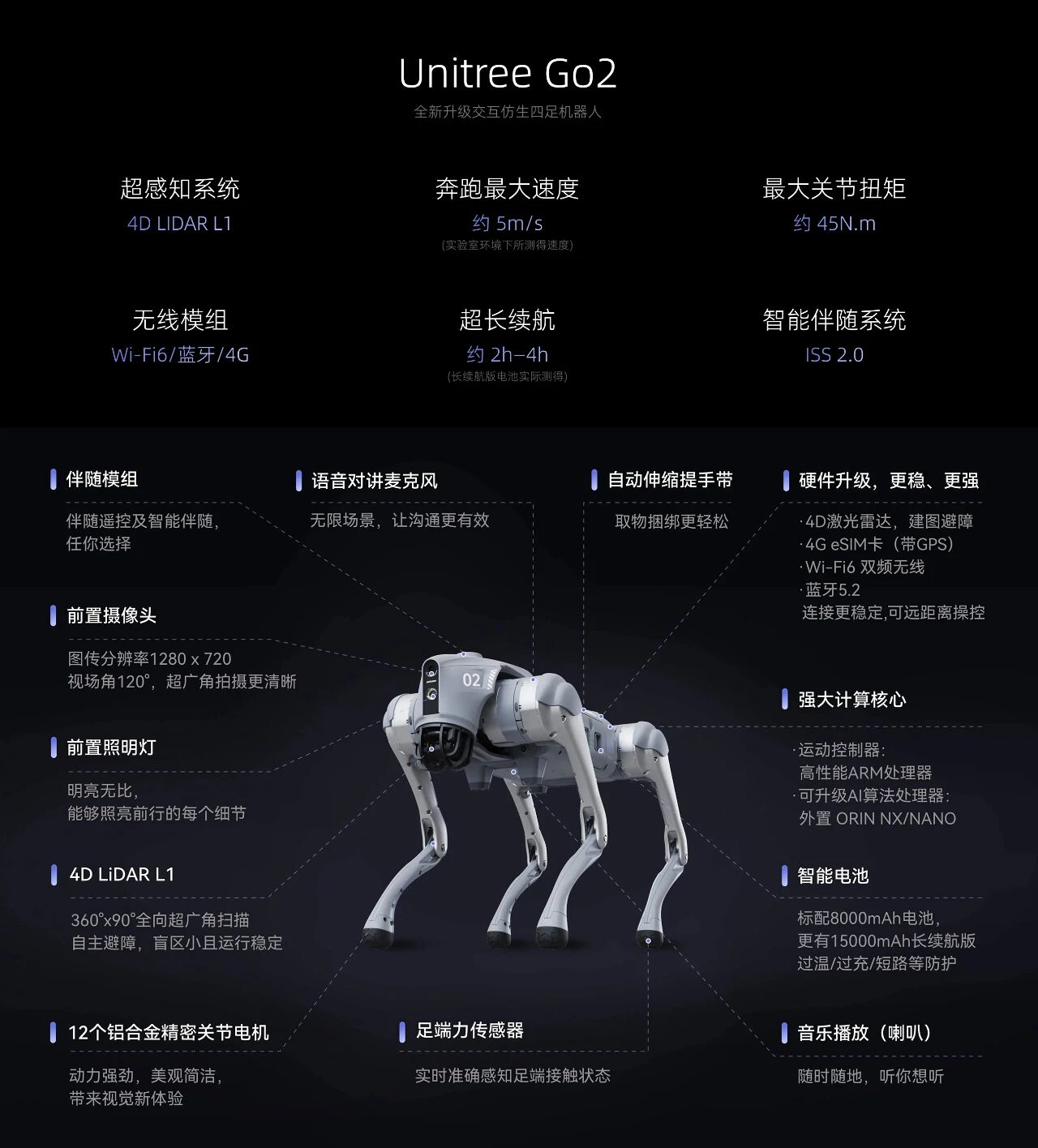 10月29日傍晚,宇树科技发布新品预告称,将会推出新的四足机器狗产品,动力性能约等于Go2的两倍。Go2是宇树科技旗下消费级四足机器人,搭载自研4D激光雷达 L1,感知系统提升200%;奔跑最大速度约 5m/s(实验室环境下所测得速度);关节性能提升30%,最大关节扭矩约 45N.m;Go2机器人电池容量升级到8000mAh,可选15000mAh超长续航电池,测得续航约 2h-4h;电压升级到28.8V,提高了电机工作效率、功率和稳定性。目前,宇树科技四足机器人家族包含消费级/科研系列Go2、Go1、A1以及行业级系列A2、B2、B1、AlienGo。同时,宇树科技已构建 H、G、R系列的通用人形机器人产品矩阵。最新发布的Unitree H2 仿生人形机器人,其以180cm 身高、70kg 体重更加贴近人类身材,采用拟人度更高的仿生脸部设计(眼睛含感知功能),可流畅完成芭蕾、武术等高柔韧度运动及时装走秀。