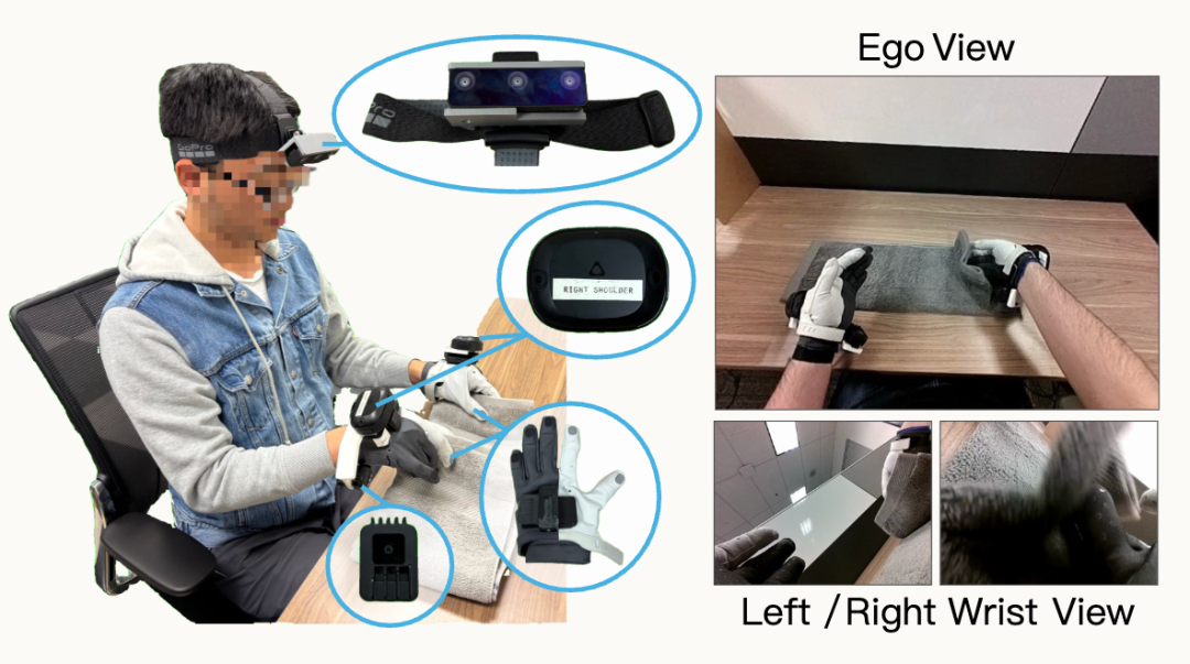 为确保人机数据的一致性,训练过程中采用与机器人相同的传感装置采集数据:Vive追踪器和Manus手套分别捕捉人类手臂与手部运动,头戴式摄像头与腕戴式摄像头同步记录第一人称及腕部视觉输入,这种配置与机器人视觉视角高度匹配,为技能迁移奠定了基础。